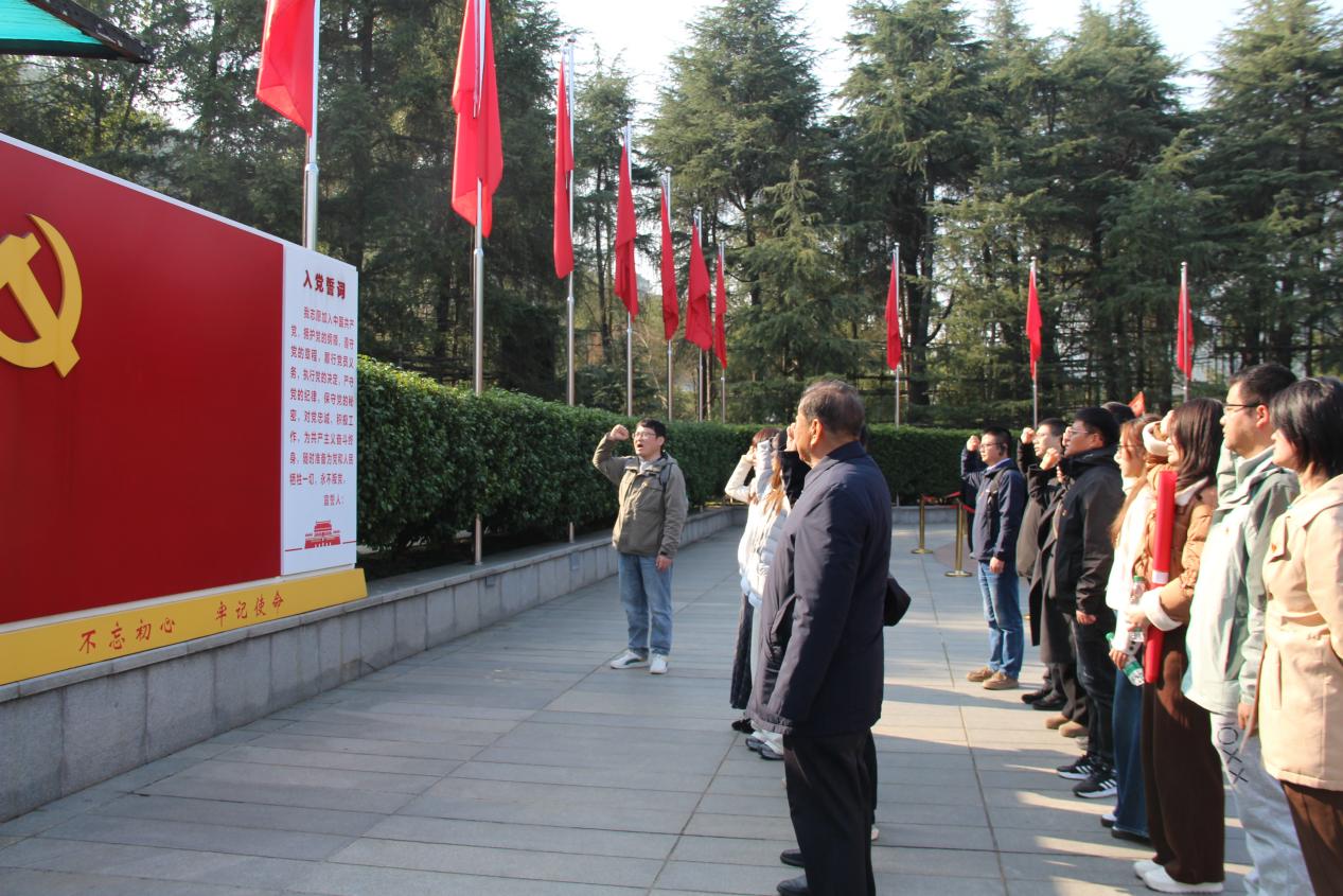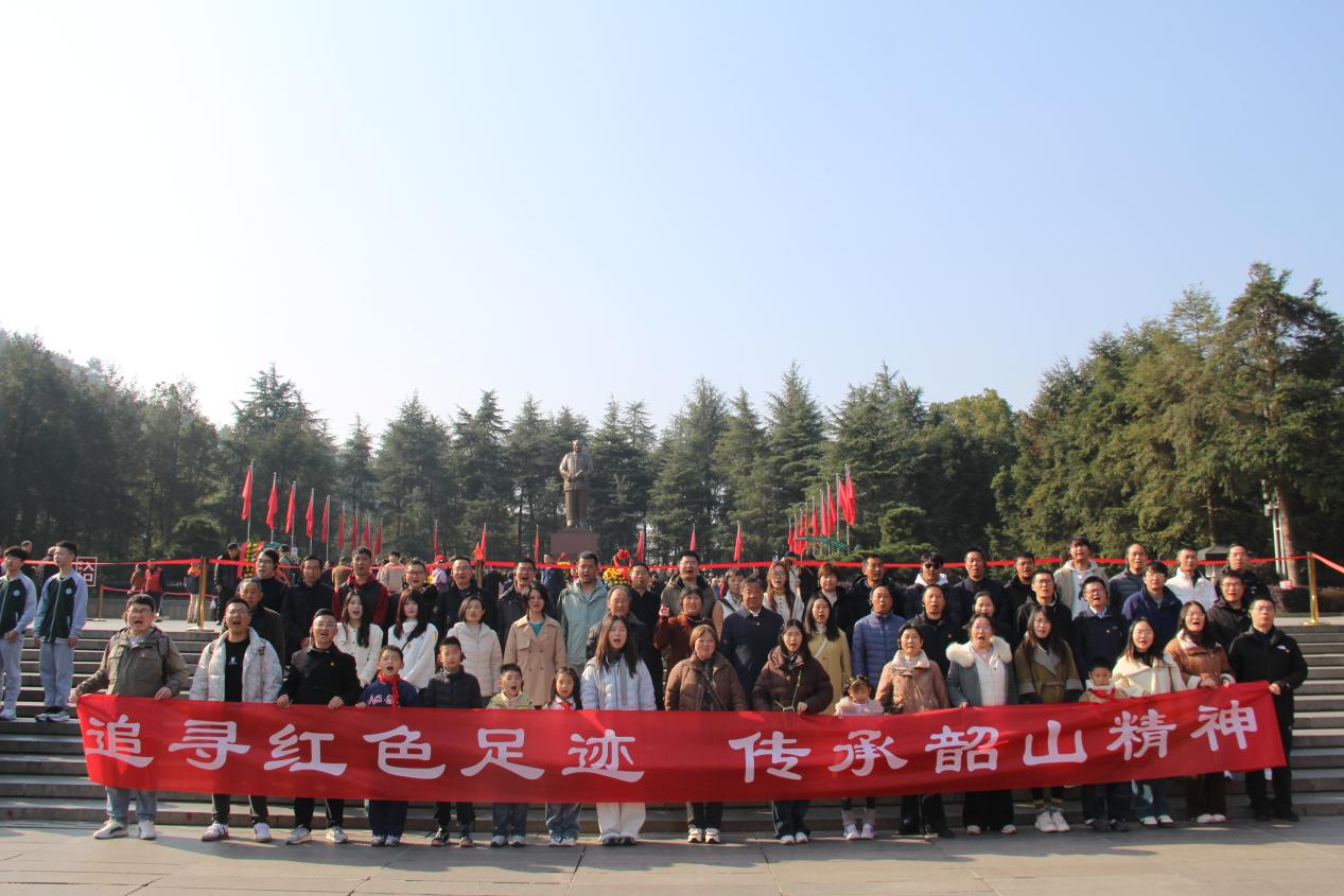 次日,团队前往韶山毛泽东故居参观学习。在毛泽东同志铜像广场,全体党员庄严肃立,向伟人铜像敬献花圈,表达对一代伟人的深切缅怀和无限敬仰。面对鲜红的党旗,全体党员举起右拳,重温入党誓词:"我志愿加入中国共产党,拥护党的纲领,遵守党的章程,履行党员义务……"铿锵有力的誓言在广场上空回荡,表达了新洲建设集团党员不忘初心、牢记使命的坚定决心。